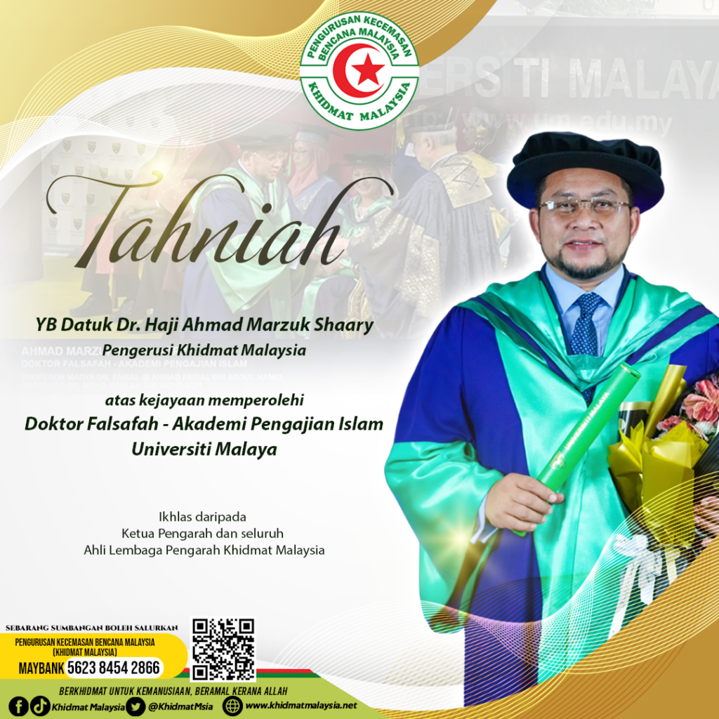Mewakili seluruh Ahli Lembaga Pengarah Khidmat Malaysia, kami mengucapkan Tahniah buat YB Datuk Dr. Haji Ahmad Ustaz Marzuk Shaary , Pengerusi Khidmat Malaysia atas kejayaan memperoleh Doktor Falsafah – Akademi Pengajian Islam sempena Istiadat Konvokesyen Universiti Malaya kali ke 63.